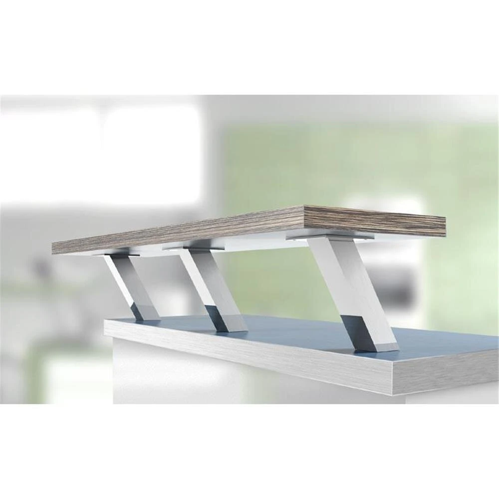 Im Rohr ist unterseitig eine Aufnahme für die Gewindestange. Loch durch die Arbeitsplatte bohren, Gewindestange durchstecken und von der Arbeitsplatten-Unterseite festschrauben. Dann die Barplatte auf die Konsolen auflegen und anschrauben.