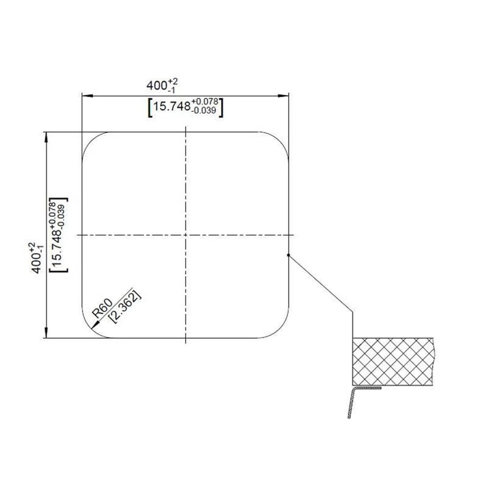 - Ausschnittmaße: 400 x 400 mm, Ecken R=60 mm