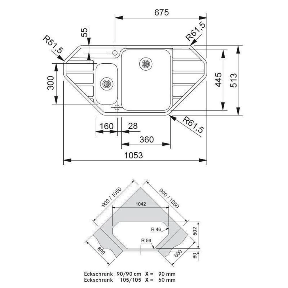- Spülenmaß: B 1053 x T 510 mm (mit entsprechenden Abschrägungen)
