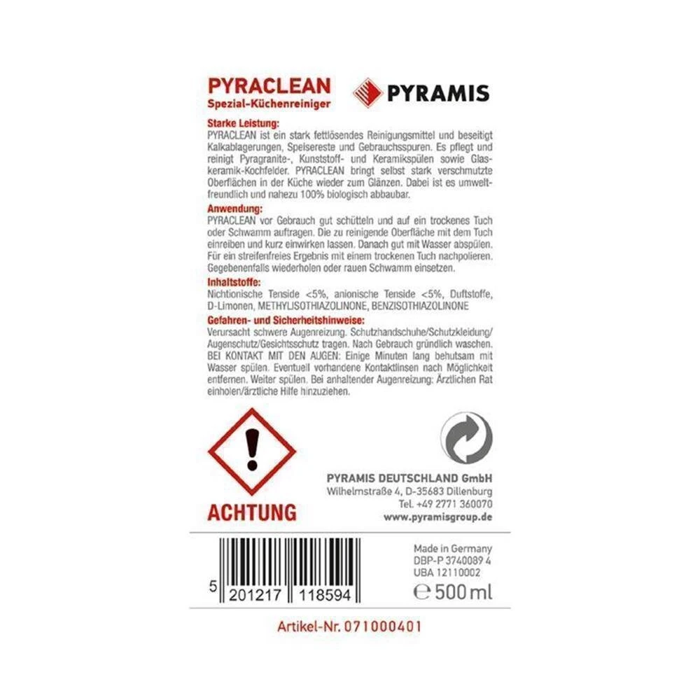 Pyraclean ist ein stark fettlösendes Reinigungsmittel und beseitigt Kalkablagerungen, Speisereste und Gebrauchsspuren. Es pflegt und reinigt Pyragranitespülen, und Keramikspülen sowie Glaskeramik-Kochfelder. Pyraclean bringt selbst stark verschmutzte Oberflächen in der Küche wieder zum Glänzen. Dabei ist es umweltfreundlich und nahezu 100% biologisch abbaubar.